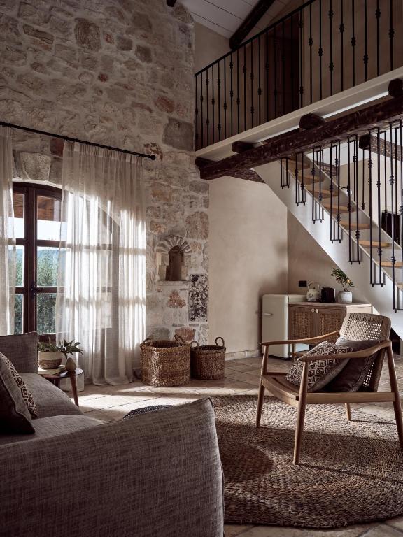 Villalar, terrakotta zeminler, tonozlu tavanlar ve el dokuması yatak başlıkları ile geleneksel tasarımı modern konforla harmanlıyor. Aile mutfağı artık bir restoran olarak hizmet veriyor ve şef Giannis Remos, sıcak ve samimi bir atmosferde yemek paylaşma geleneğini sürdürerek Giatria ailesinin nesiller boyu süren geleneğini devam ettiriyor.